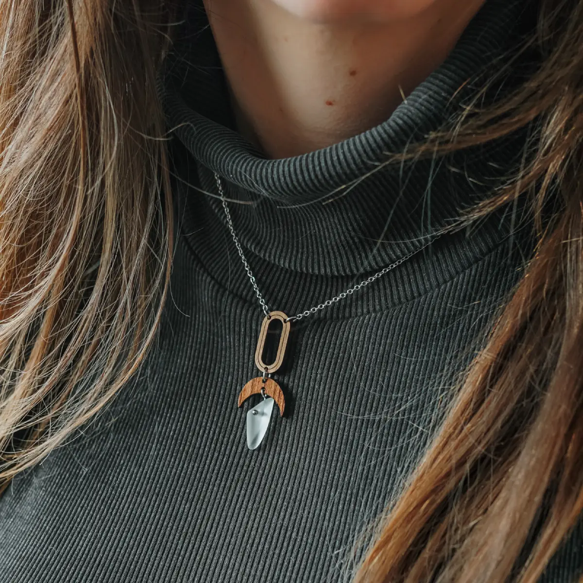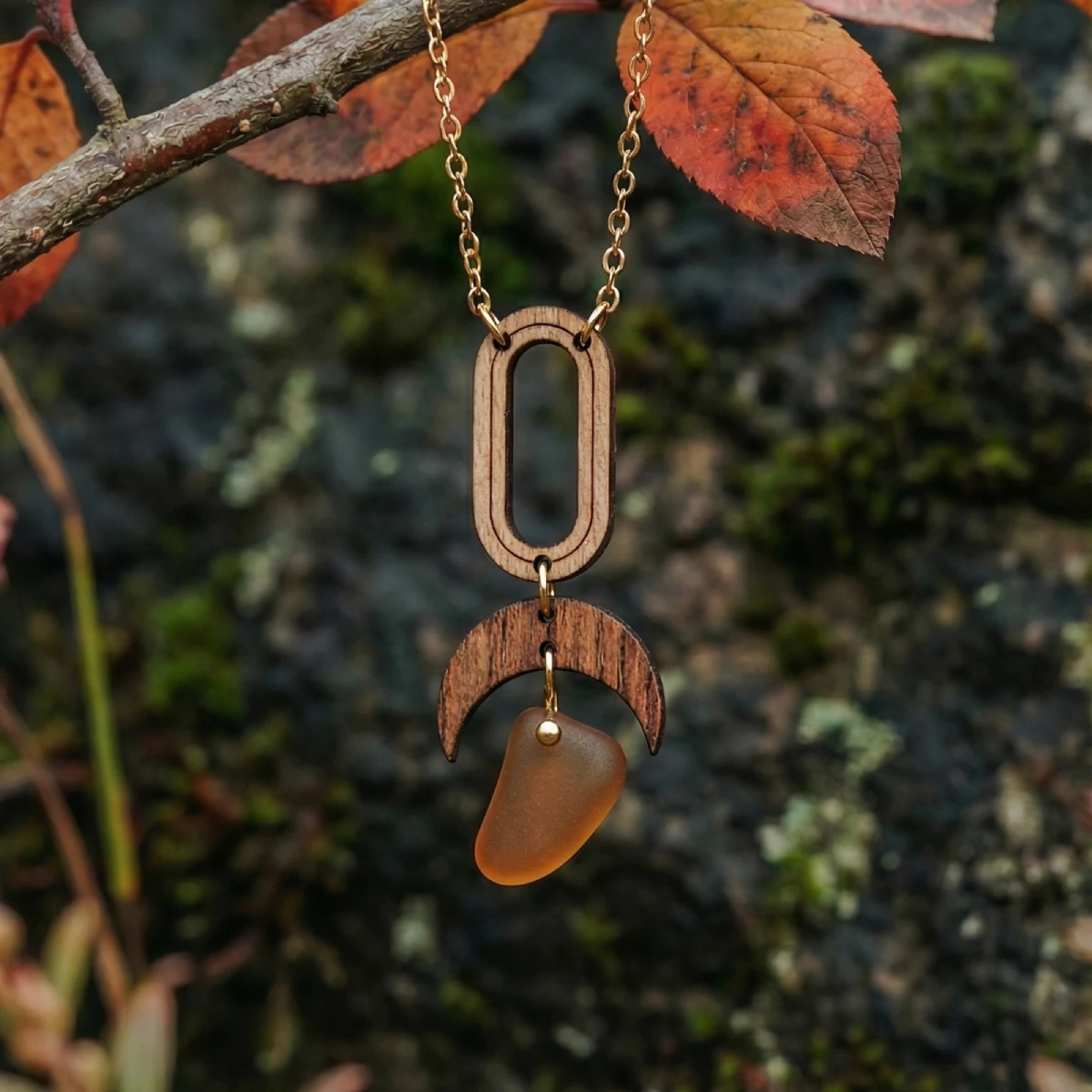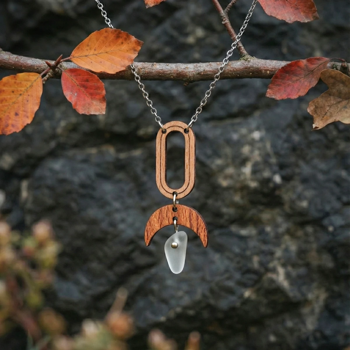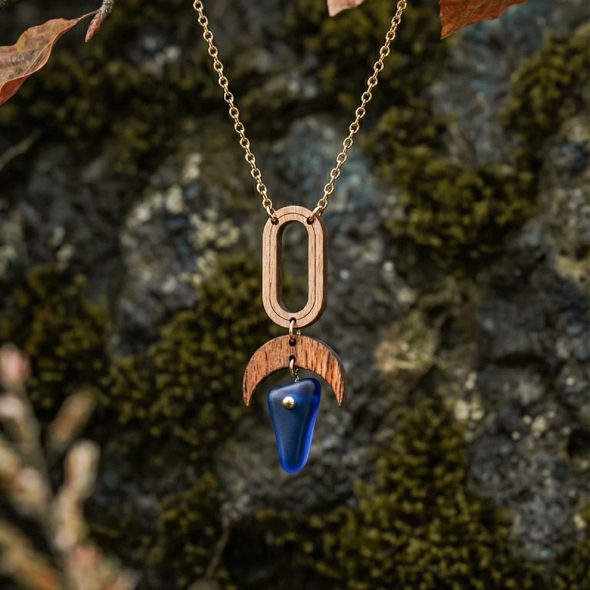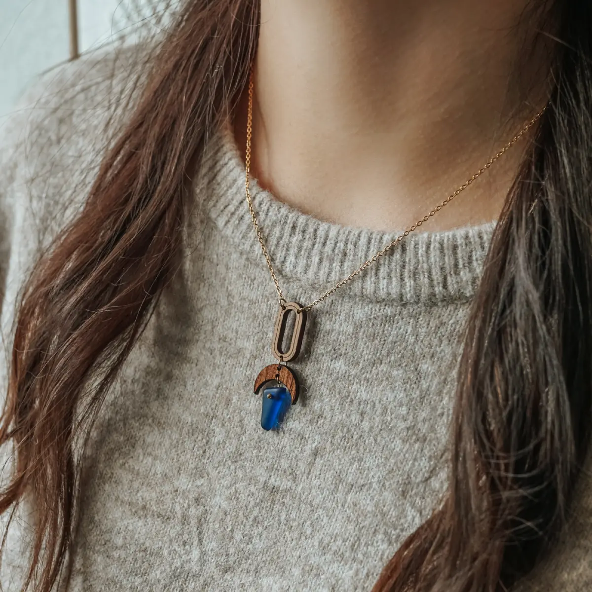 Diese in unserer kleinen Werkstatt entworfene und gefertigte Halskette aus Holz und Recyclingglas kombiniert ein einzigartiges Glasfragment mit Schweizer Buchenholz aus einer lokalen Tischlerei. Da keine zwei Scherben identisch sind, ist Ihre Recyclingglas-Halskette natürliches und umweltfreundliches suchen , ist Naëlis genau das Richtige für Sie!
