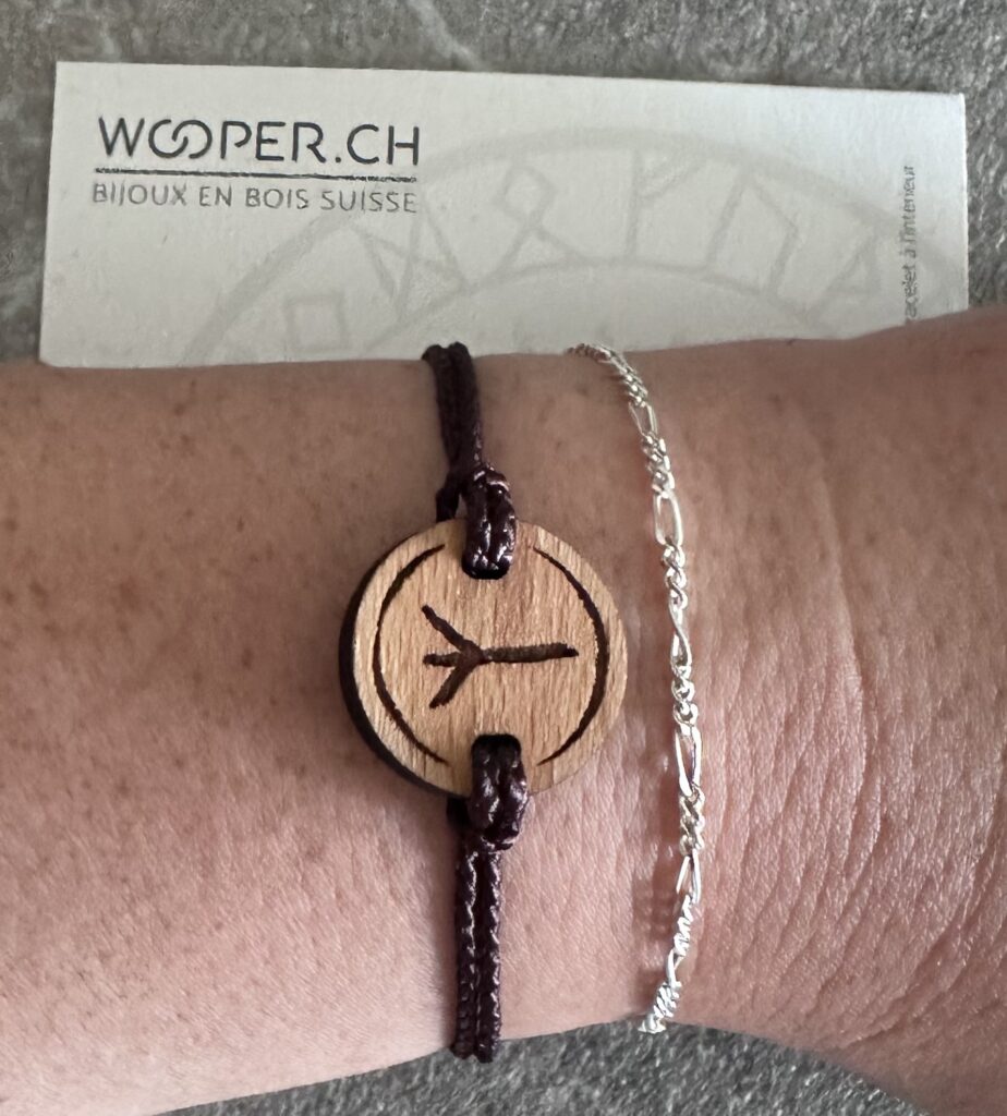 This bracelet is designed and then made from carefully selected Swiss beech wood in a local carpentry and its cord is made from recycled PET.