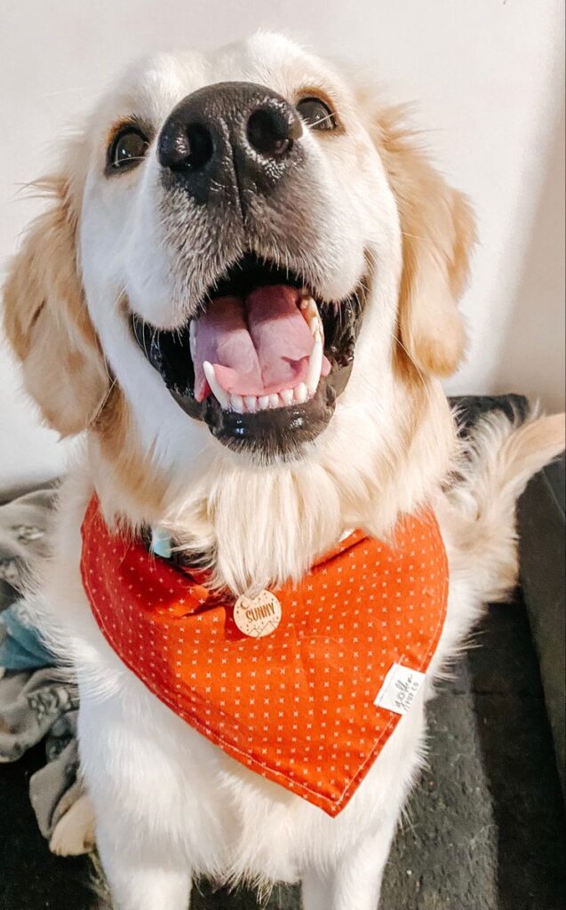 J’ai juste un petit bémol de ma part qui est la taille. Elle est un peu petite pour les poils de mon Golden. Jai mis un bandana pour qu’on puisse la voir sur la photo.